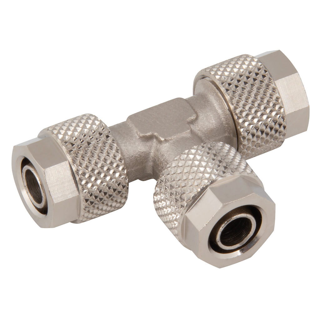 Pneumatic Quick-fit Push-on Fitting, Equal, Tee Connector, to Fit 5/3 Tube, Nickel Plated Brass, Working Temperature -18°C to +70°C, Maximum Working Pressure 15 bar, FT Pro