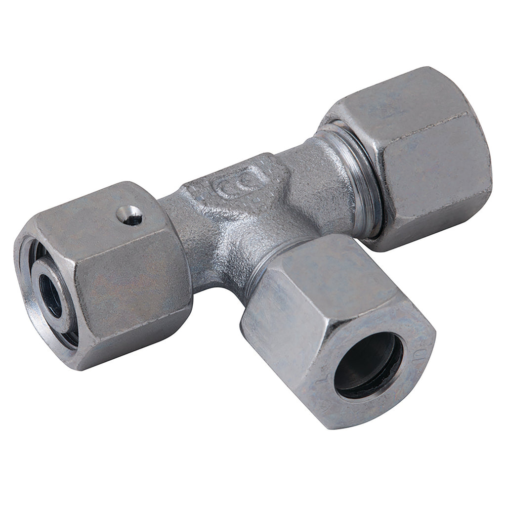 M16 x 1.5 Metric Female x 8mm Outside Diameter, DIN 2353, Tube Fitting, S Series, Swivel Run Tee, Steel, Conexa