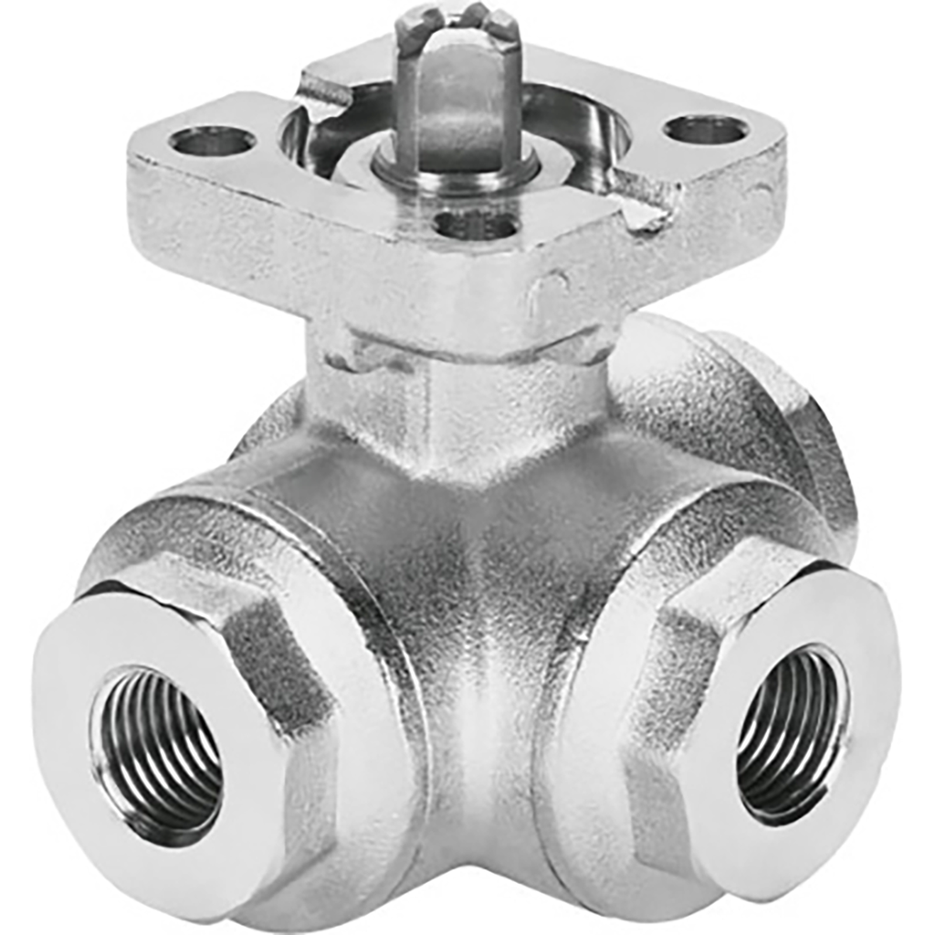 Ball Valve Vzba-11/4"-Ggg-63-32L-F0405-V4V4T Stainless Steel, 3/2-Way, Nominal Width 11/4", Top Flange F0405, Pn63, Thread En 10226-1. Design Structure=(* 3-Way Ball Valve, * L Hole), Type of Actuation=Mechanical, Sealing Principle=Soft, Assembly Position=Any, Mounting Type=Line Installation, Festo