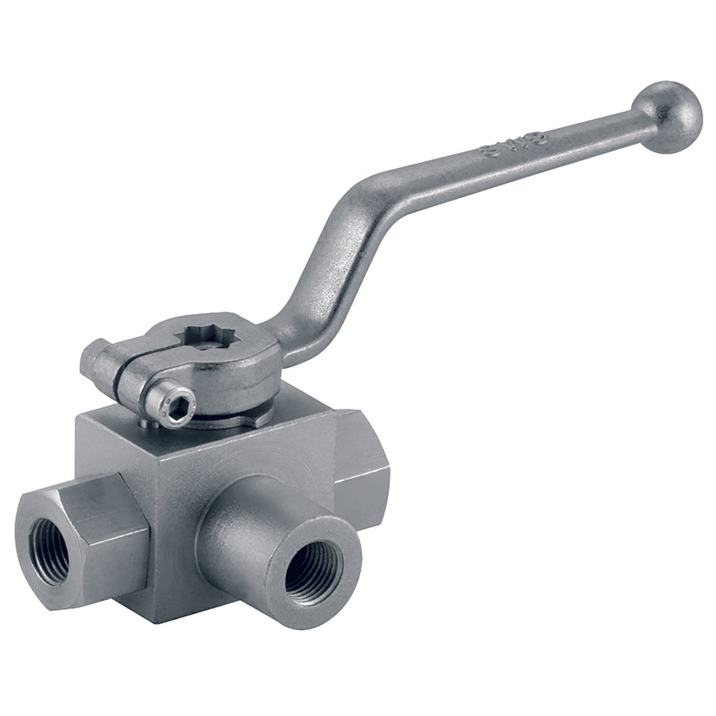 1/2" BSP Parallel Female, Hydraulic Ball Valve, 3 Way, L Ported, Standard, 83mm Length, Carbon Steel, Working Temperature -20?é?¼?ó?å?¥C to +120?é?¼?ó?å?¥C, Maximum Working Pressure 500 bar, LHA