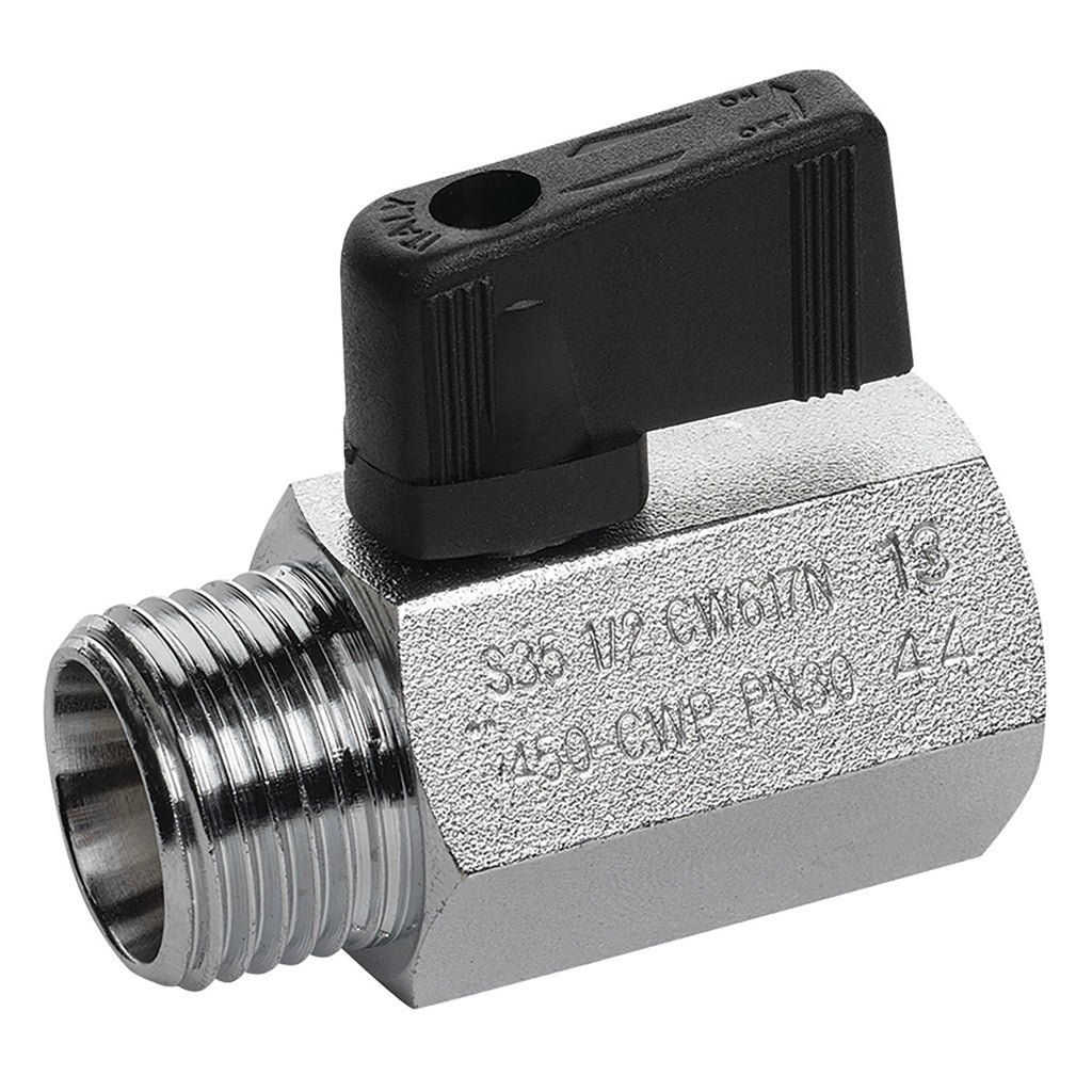 1/2" BSP Parallel Female x 1/2" BSP Parallel Male, High Pressure Mini Ball Valve, Black Handle, Nickel Plated Brass, PTFE Seal, Working Temperature -20°C to +90°C, Working Pressure 30 bar, RUB
