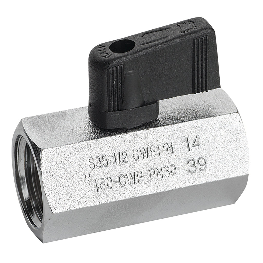 1/2" BSP Parallel Female, High Pressure Mini Ball Valve, Black Handle, Nickel Plated Brass, PTFE Seal, Working Temperature -20°C to +90°C, Maximum Working Pressure 30 bar, RUB