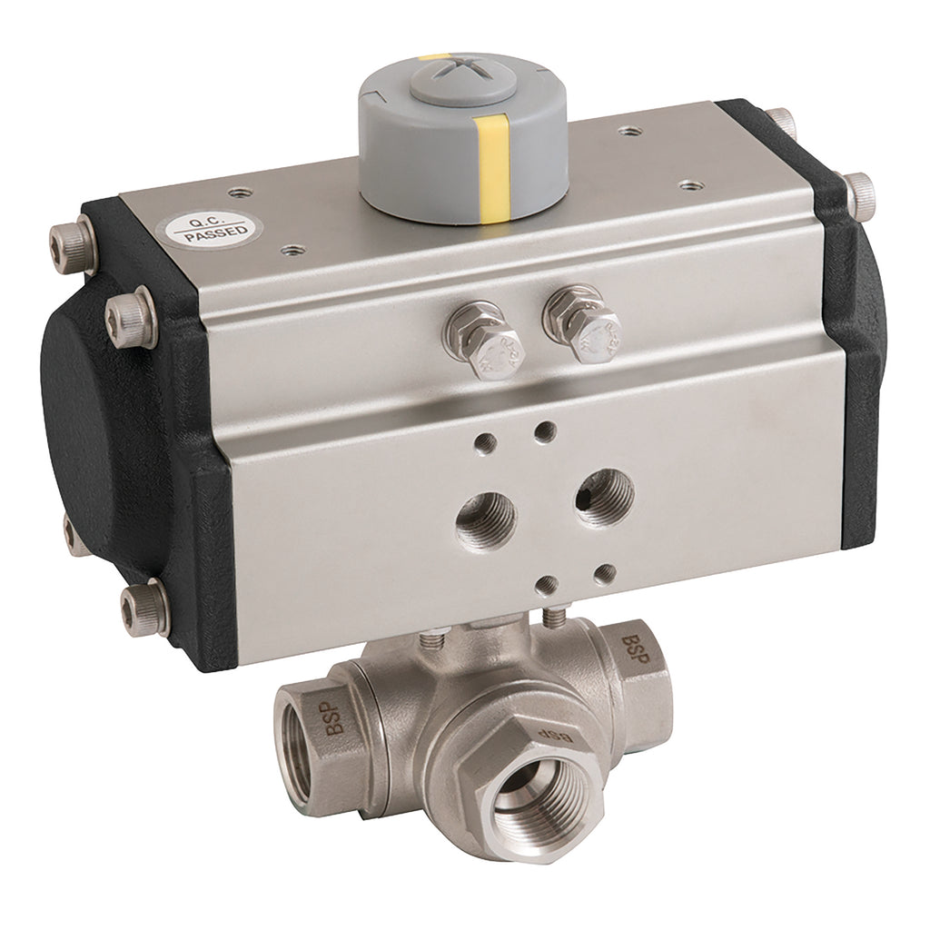 1" BSP Parallel, 3 Way Ball Valve Fitted with a Pneumatic Actuator, L Port, Double Acting, Stainless Steel Valve Material, FPM Seal Material, Valve Working Temperature -25°C to +180°C, Actuator Working Temperature -20°C to +90°C, Valve Maximum Working Pressure 63 bar, Haitima
