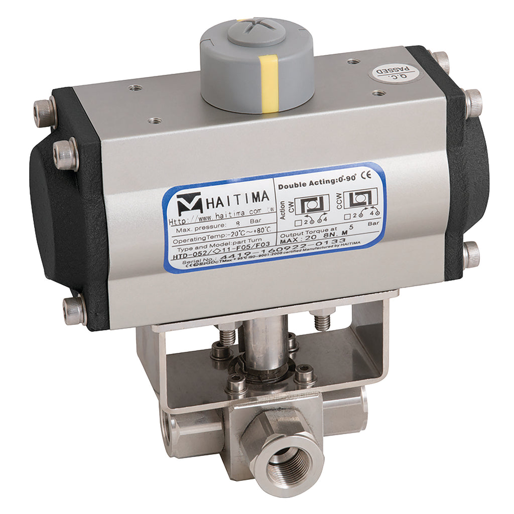 1/4" BSP Parallel, High Pressure 3 Way Ball Valve Fitted with a Pneumatic Actuator, L Port, Single Acting, Stainless Steel Valve Material, PVDF Seal Material, Valve Working Temperature 0°C to +150°C, Actuator Working Temperature -20°C to +90°C, Valve Maximum Working Pressure 413.69 bar, Haitima, FT Pro