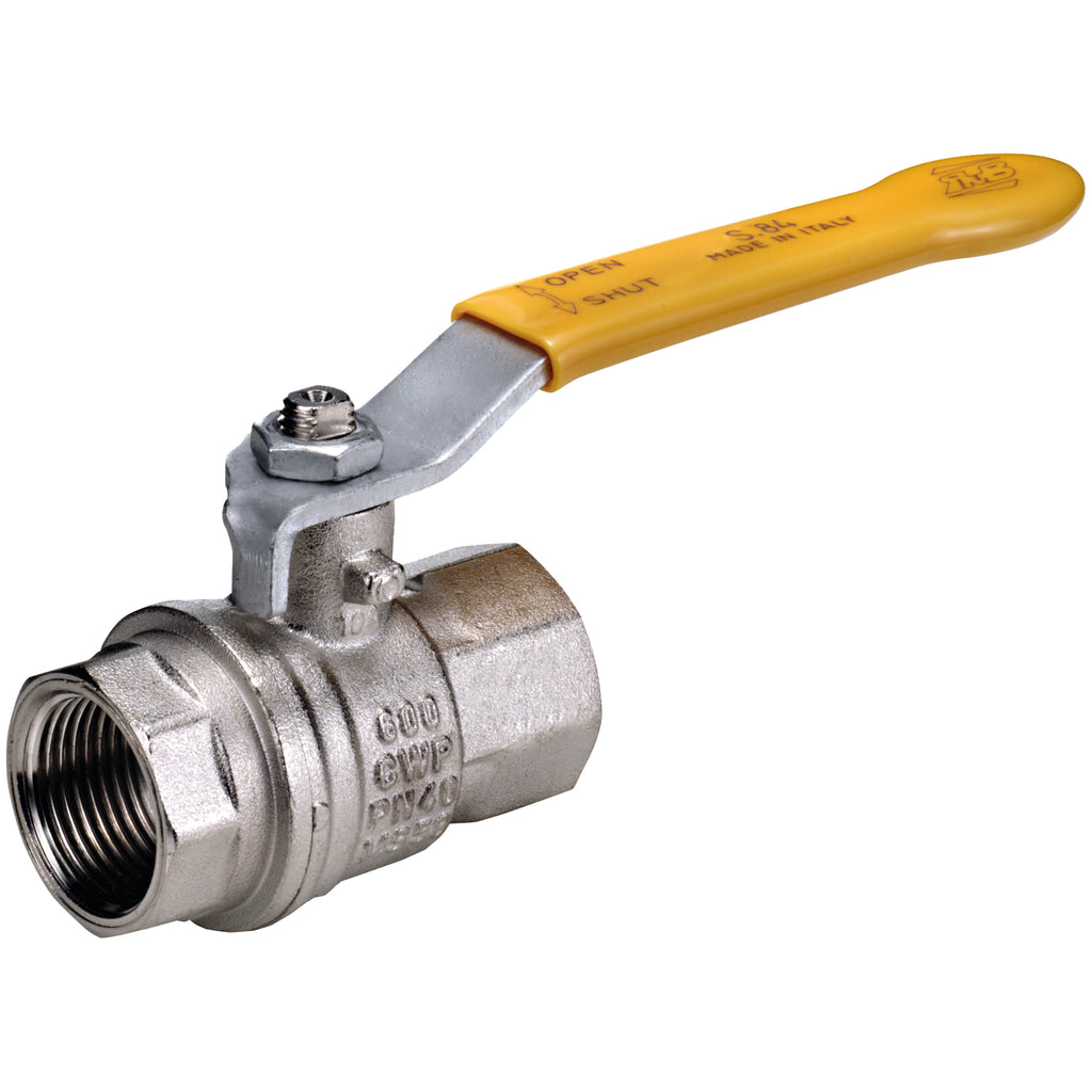1/4" BSP Parallel Female, Dual Sealing Gas Approved Ball Valve, EN331, Yellow Handle, Nickel Plated Brass, PTFE Seal, Working Temperature -40C to +170°C, Maximum Working Pressure 40 bar, RUB