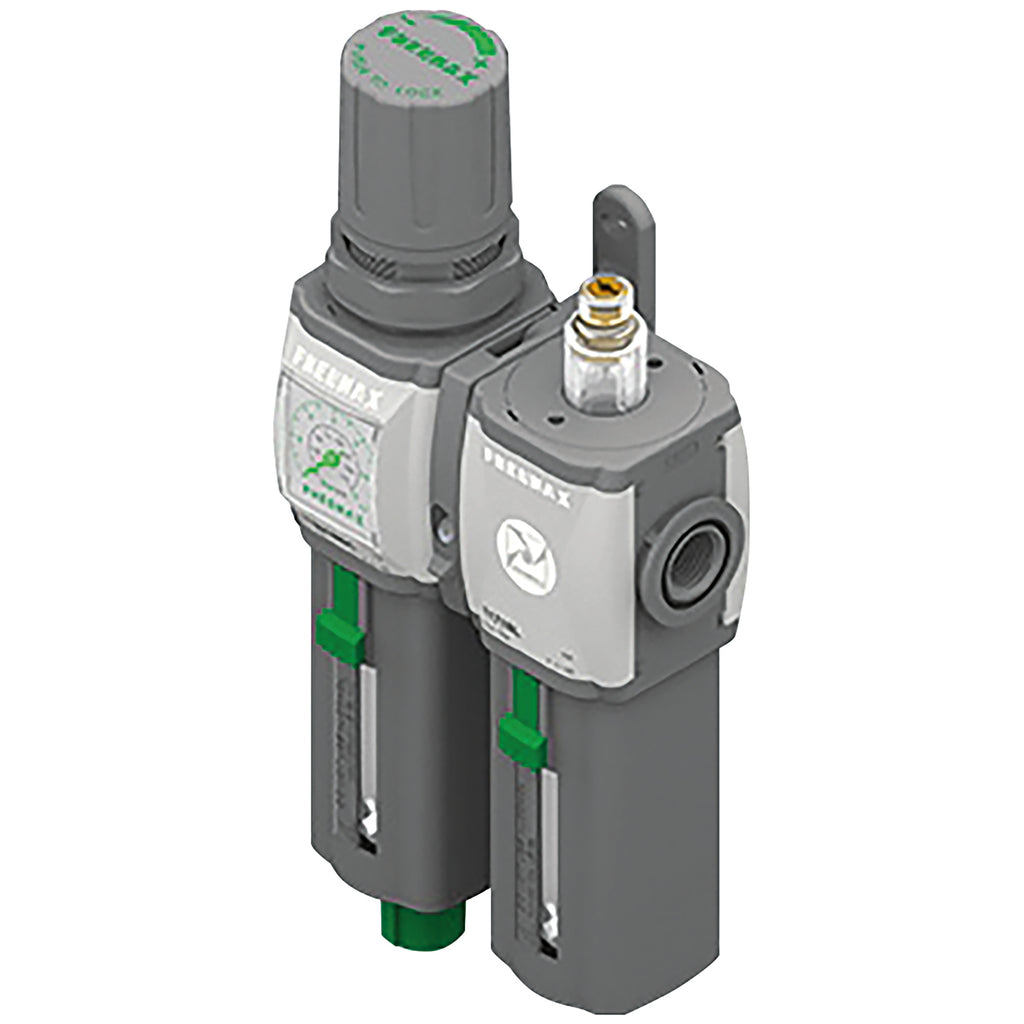 1/4" BSP Parallel Female, Air Preparation, Airplus Series, Semi Auto Drain, Filter + Regulator + Lubricator and Gauge, 20 Micron, Working Temperature -5°C to +50°C, Maximum Working Pressure 12 bar, Pneumax