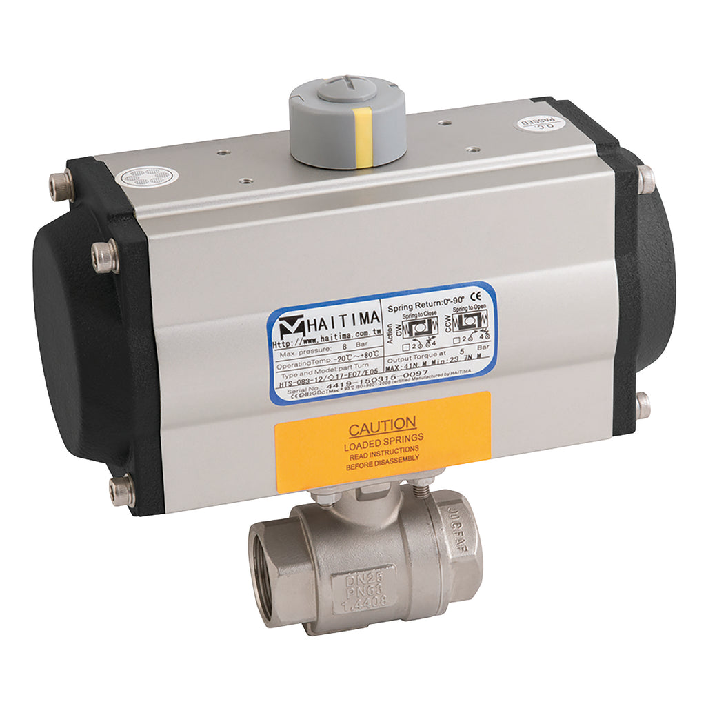 1" BSP Parallel, 2 Piece Full Bore Ball Valve Fitted with a Pneumatic Actuator, Double Acting, ATEX Approved, Stainless Steel Valve Material, Viton Seal Material, Valve Working Temperature -20°C to +200°C, Actuator Working Temperature -20°C to +90°C, Valve Maximum Working Pressure 63 bar, Haitima