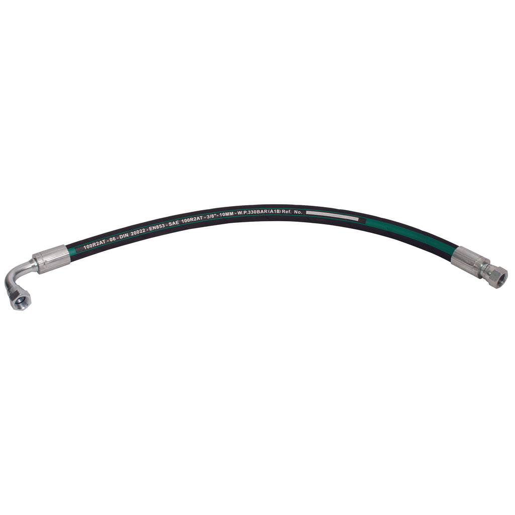 1" BSP Parallel Female x 38.9mm Outside Diameter x 1" Inside Diameter, Hydraulic Hose Assembly, Two Wire Braid EN853-2, 90° Swivel Female x Straight Swivel Female, Straight Hose End A x 90° Elbow Hose End B, 300mm Bend Radius, 800mm Length, Burst Pressure 650 bar, Maximum Working Pressure 165 bar, FT Pro