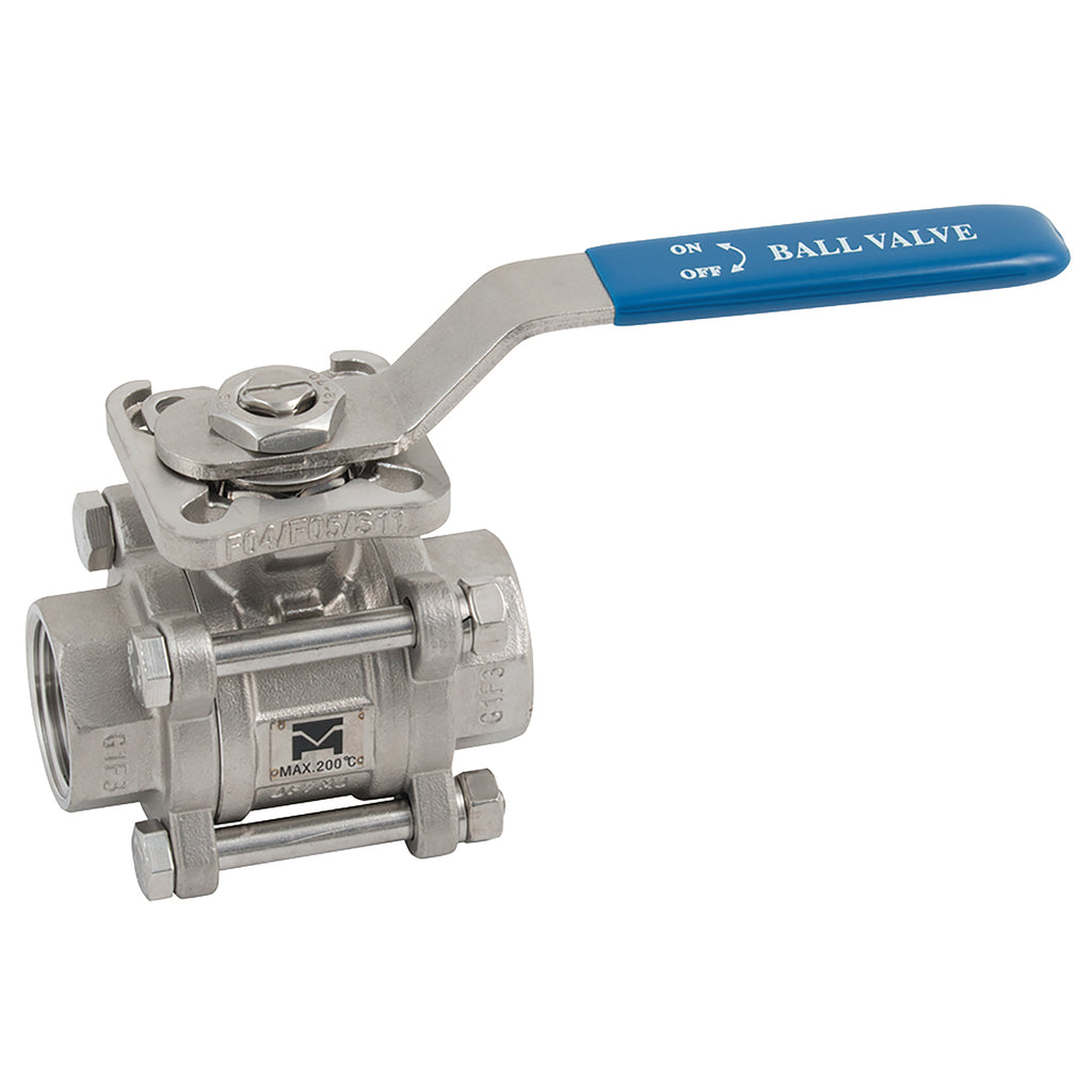 1" BSP Parallel, 3 Piece, Direct Mount Full Bore Ball Valve, ATEX Approved, Stainless Steel, Viton Seal Material, RTFE Seat Material, Working Temperature -20°C to +200°C, Maximum Working Pressure 63 bar, Haitima