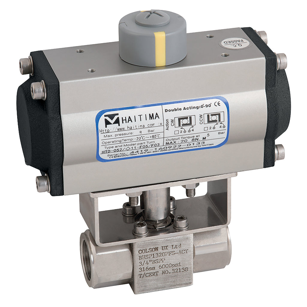 1" BSP Parallel, High Pressure Ball Valve Fitted with a Pneumatic Actuator, Single Acting, Stainless Steel Valve Material, PVDF Seal Material, Valve Working Temperature 0°C to +150°C, Actuator Working Temperature -20°C to +90°C, Valve Maximum Working Pressure 399.96 bar, Haitima, FT Pro