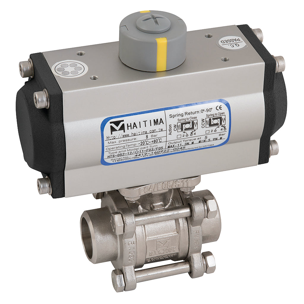 1" Butt Weld, 3 Piece Full Bore Ball Valve Fitted with a Pneumatic Actuator, Double Acting, ATEX Approved, Stainless Steel Valve Material, Viton Seal Material, Valve Working Temperature -20°C to +200°C, Actuator Working Temperature -20°C to +90°C, Valve Maximum Working Pressure 63 bar, Haitima