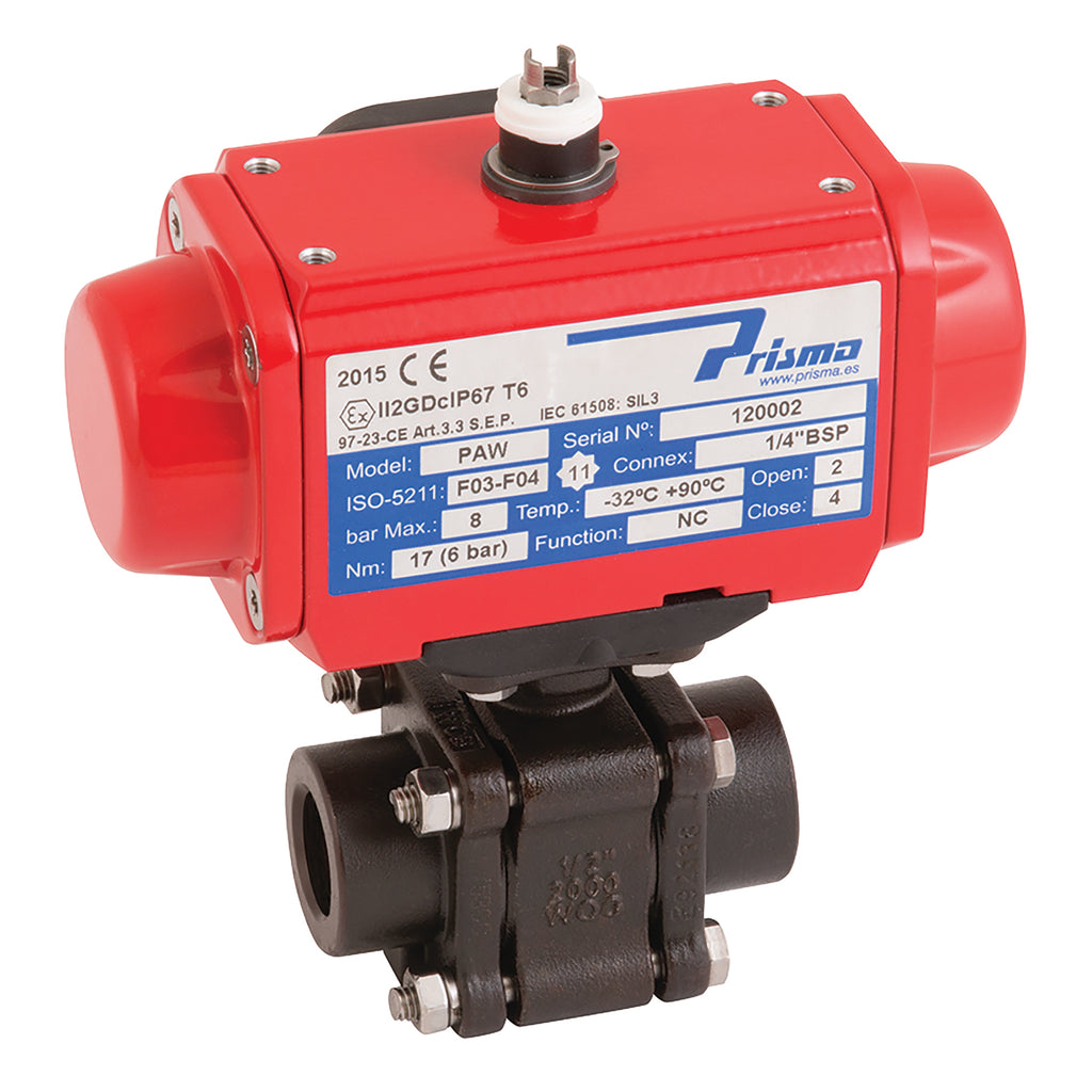 1" Socket Weld, 3 Piece Ball Valve Fitted with a Pneumatic Actuator, Single Acting, ATEX, Fire Safe Approved, Carbon Steel Valve Material, Viton Seal Material, Valve Working Temperature -20?©°C to +220?©°C, Actuator Working Temperature -32?©°C to +80?©°C, Valve Maximum Working Pressure 138 bar, Prisma, Haitima