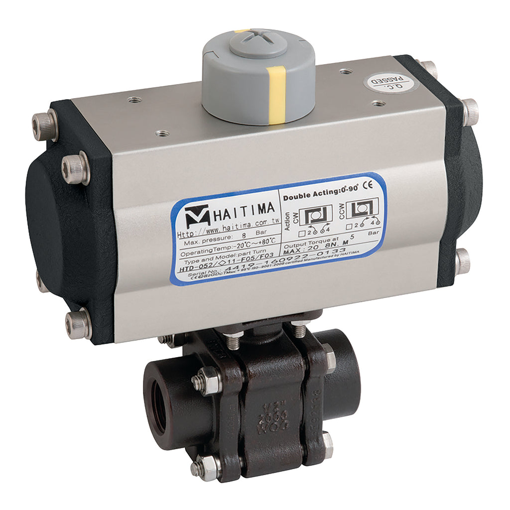 1" NPT, 3 Piece Ball Valve Fitted with a Pneumatic Actuator, Single Acting, ATEX, Fire Safe Approved, Carbon Steel Valve Material, Viton Seal Material, Valve Working Temperature -20°C to +220°C, Actuator Working Temperature -20°C to +90°C, Valve Maximum Working Pressure 138 bar, Haitima