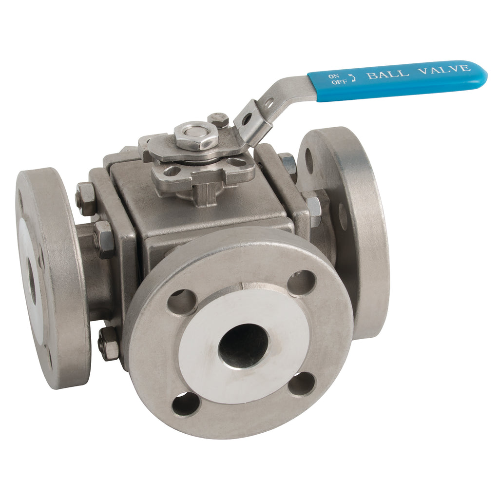 1" PN16 Flange, 3 Way, Direct Mount Full Bore Ball Valve, T Port, Stainless Steel, Viton Seal Material, RTFE Seat Material, Working Temperature -20°C to +200°C, Maximum Working Pressure 16 bar, Haitima
