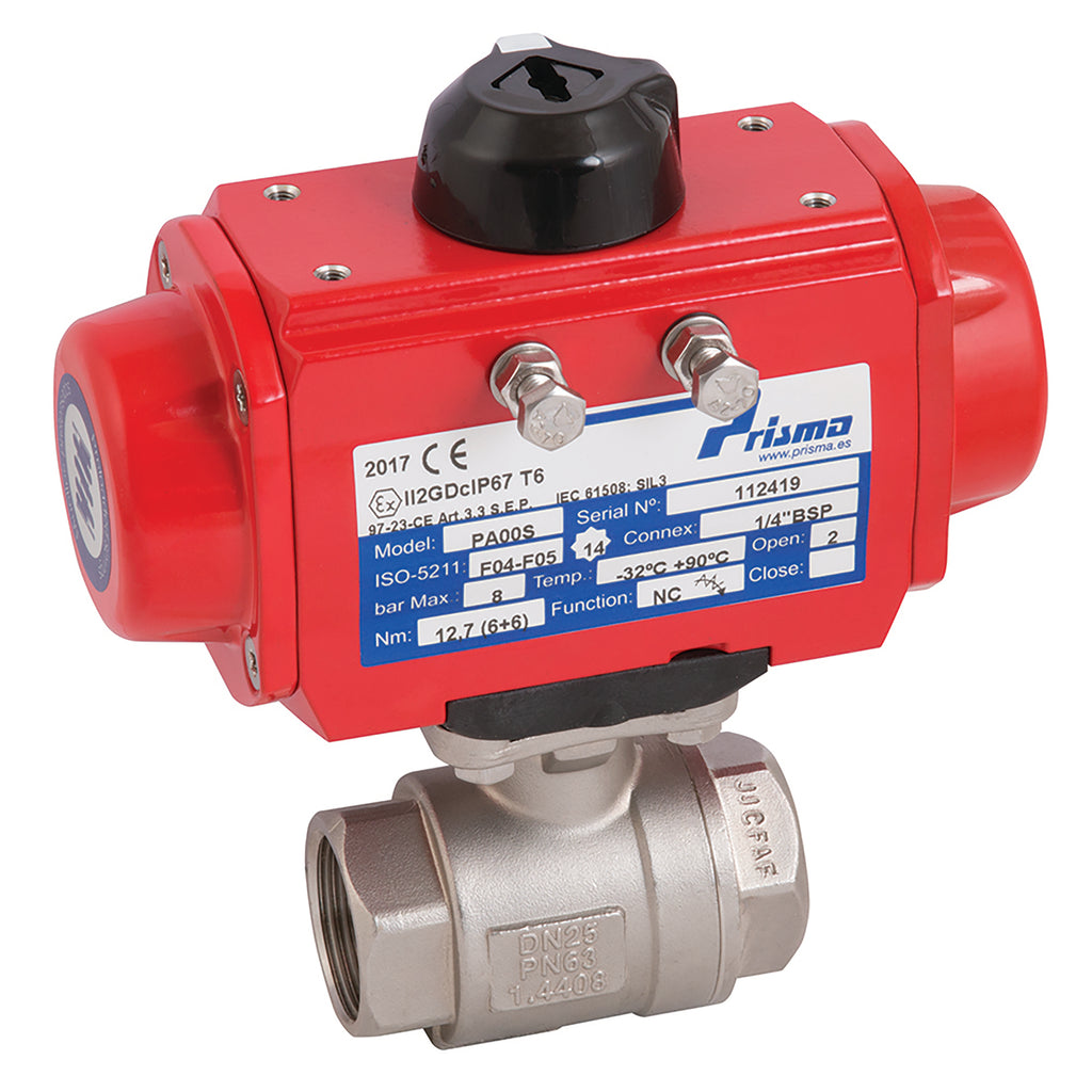 1" BSP Parallel Female, Pneumatic Actuated Stainless Steel High Pressure Valve, Single Acting Actuation, Spring Return, Maximum Working Pressure 408 Bar, Prisma