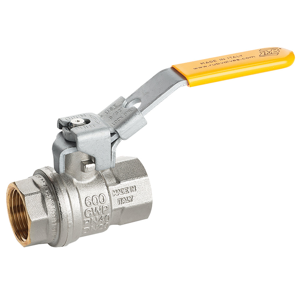 2.1/2" BSP Parallel Female, Dual Sealing Gas Lockable Ball Valve, EN331, Yellow Handle, Nickel Plated Brass, PTFE Seal, Working Temperature -40°C to +170°C, Maximum Working Pressure 30 bar, RUB