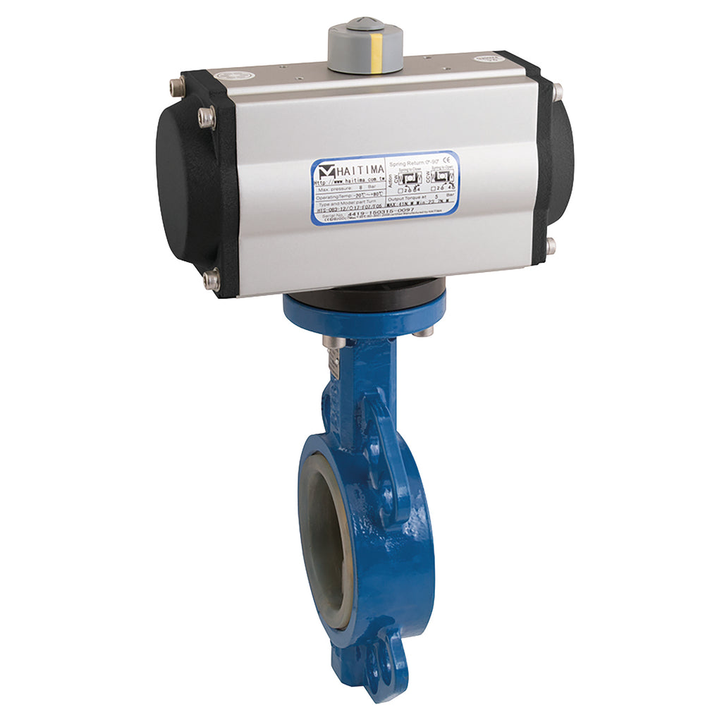 2" BS 10 Table D/E, PN6/PN10/PN16/ANSI150 Flange, Wafer Pattern Butterfly Valve Fitted with an Actuator, Double Acting, Cast Iron Valve Material, Silicone Liner, Stainless Steel Disc Material, Actuator Working Temperature -20°C to +90°C, Valve Working Temperature -30°C to +180°C, Valve Working Pressure 16 bar, Haitima, HUK Valves