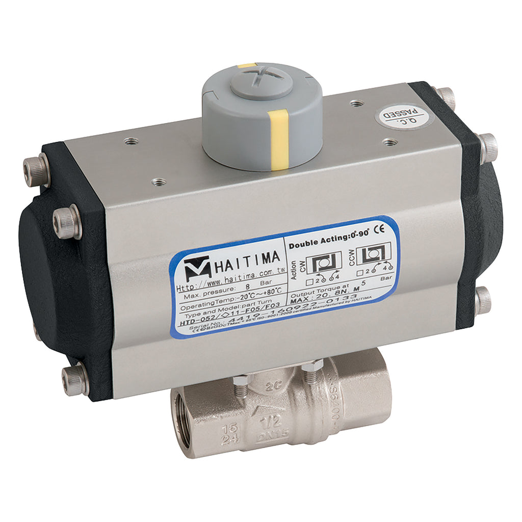3/4" BSP Parallel, 2 Piece Ball Valve Fitted with a Pneumatic Actuator, Single Acting, WRAS Approved, Nickel Plated Brass Valve Material, FPM Seal Material, Valve Working Temperature -20°C to +170°C, Actuator Working Temperature -20°C to +90°C, Valve Maximum Working Pressure 40 bar, Haitima, RuB Valves