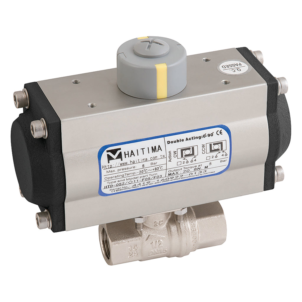 3/4" BSP Parallel, 2 Piece Ball Valve Fitted with a Pneumatic Actuator, Double Acting, WRAS Approved, Nickel Plated Brass Valve Material, FPM Seal Material, Valve Working Temperature -20°C to +170°C, Actuator Working Temperature -20°C to +90°C, Valve Maximum Working Pressure 40 bar, Haitima, RuB Valves