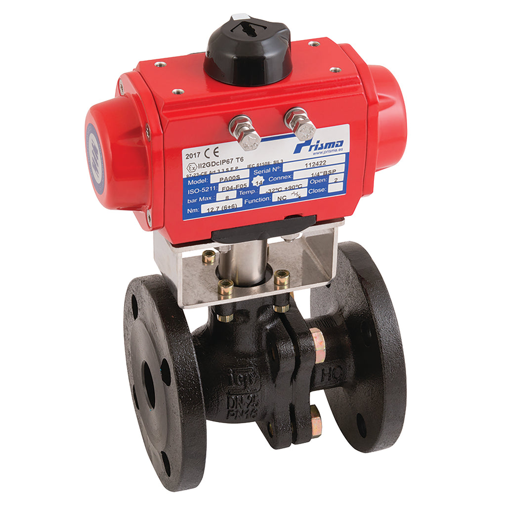 3/4" PN16 Flange, 2 Piece Ball Valve Fitted with a Pneumatic Actuator, Single Acting, ATEX Approved, Cast Iron Valve Material, FPM Seal Material, Valve Working Temperature -10?é°C to +200?é°C, Actuator Working Temperature -32?é°C to +80?é°C, Valve Maximum Working Pressure 16 bar, Prisma, ICP Valves
