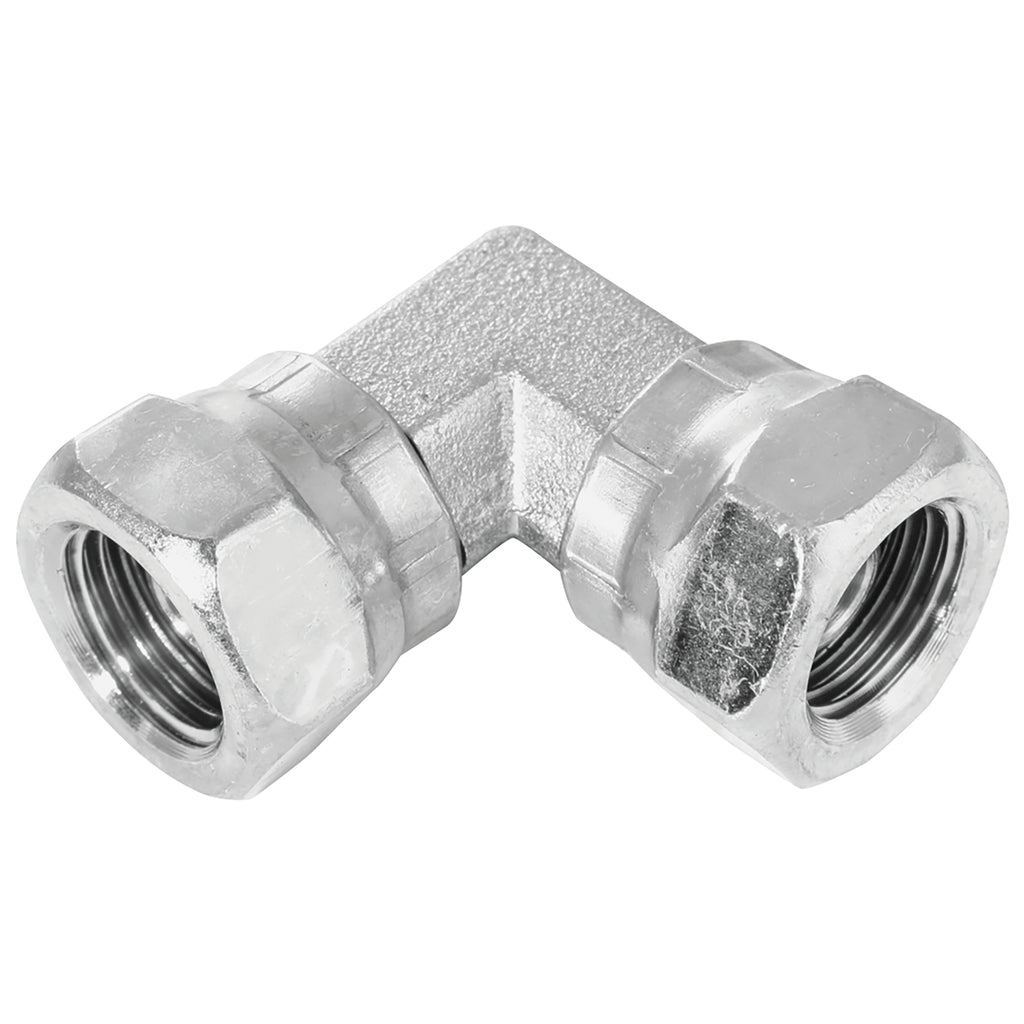 3/8" BSP Parallel Female x 3/8" BSP Parallel Female, Hydraulic Adaptor Steel, Swivel Forged 60° Cone, 90° Compact Elbow, Zinc Plated Mild Steel, Maximum Working Pressure 380 bar, Burnett & Hillman