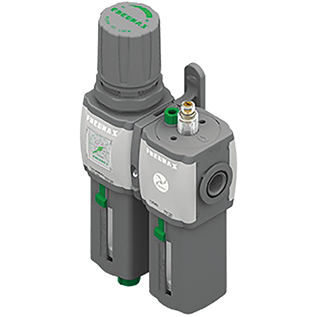 3/8" BSP Parallel Female, Air Preparation, Airplus Series, Auto Drain, Filter + Regulator + Lubricator and Gauge, 20 Micron, Working Temperature -5°C to +50°C, Maximum Working Pressure 12 bar, Pneumax