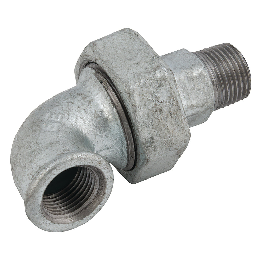 3/8" BSP Tapered Male x 3/8" BSP Parallel Female, Malleable Iron Pipe Fitting, Galvanised, Union 90° Elbow Taper Seat, Fig. 98, Working Temperature -20°C to +120°C, Maximum Working Pressure 25 bar, EE