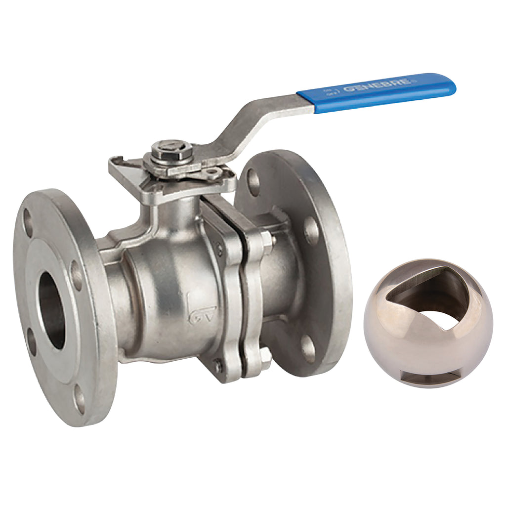 3" ANSI150 Flange, 2 Piece, Direct Mount Fire Safe V-Ball Valve, 90° Ball Angle, Stainless Steel, FPM Seal Material, PTFE Filled with 15% Glass Seat Material, Working Temperature -30°C to +180°C, Maximum Working Pressure 19.6 bar, Genebre