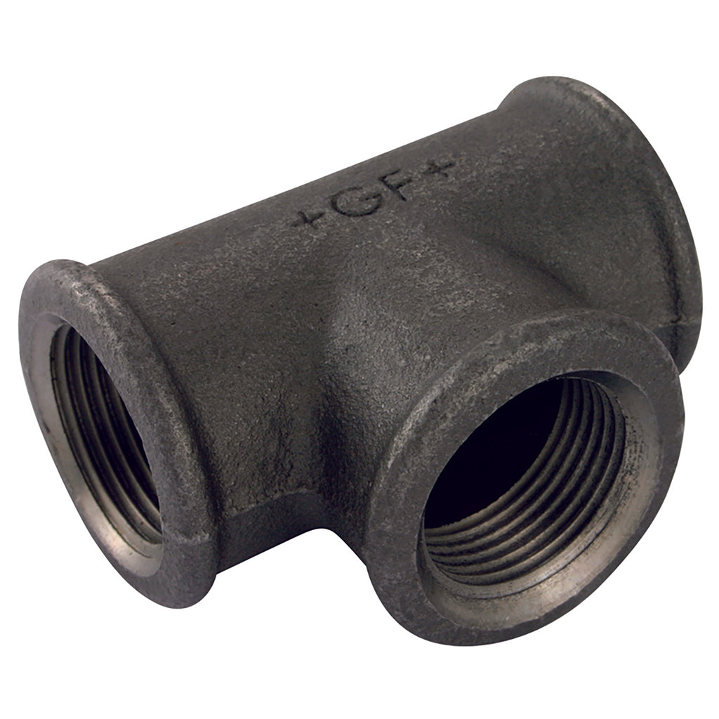 3" BSP Parallel Female x 1.1/2" BSP Parallel Female, Malleable Iron Pipe Fitting, Black, Unequal Tee, Reducing on Branch, Fig. 130, Working Temperature -20°C up to +120°C, Maximum Working Pressure 25 bar, GF