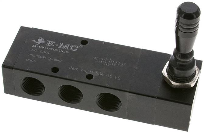 Genuine EMC H 534-15 ES – H 534-15 ES (EMC) 5/3-way hand lever valve, G 1/2", Center position vented, spring return. Designed for reliable performance in industrial pneumatic systems, this component is suitable for maintenance, repair, and OEM applications.