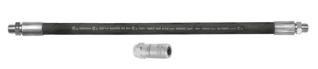 Double steel braid reinforced rubber hoses with 4-jaw connector with check valve. For hand operated and air powered grease pumps. 1/8" NPT (MM)