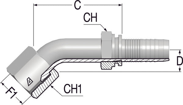 1.1/16" -12 JIC 45deg Elbow x 5/8 Hose