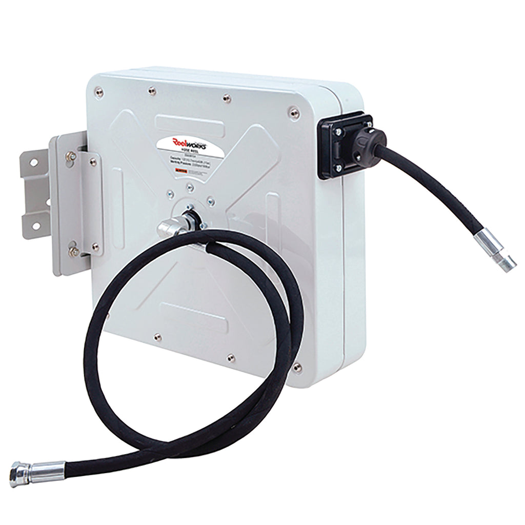 Reelworks Spring Rewind, Corrosion resistant powder coating, Supplied with 1.5m feeder hose, Hose capacity: 30 / 10m, Hose ID: 3/8"