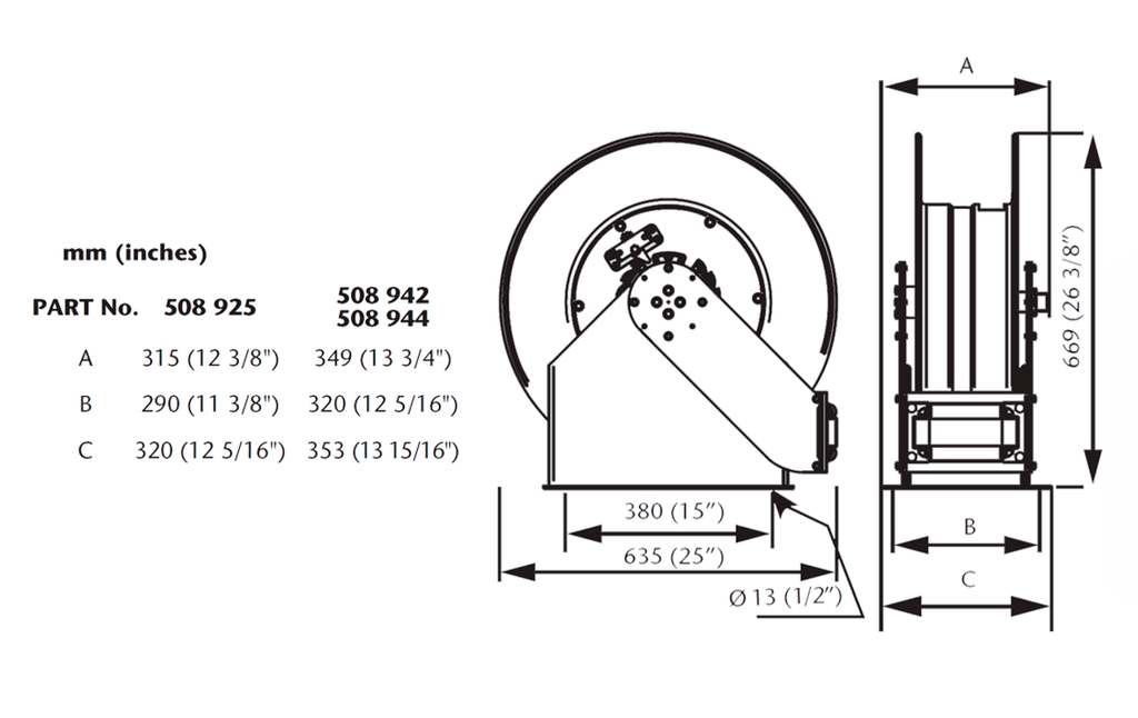 RM-100 heavy-duty large capacity hose reel for lubricants and waste oil evacuation.