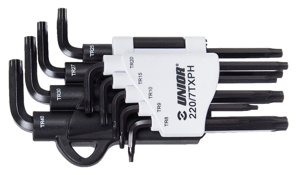 - 9x wrench with TX profile and hole (article 220/7TX) dim. TR 8, TR 9, TR 10, TR 15, TR 20, TR 25, TR 27, TR 30, TR 40 on plastic clip