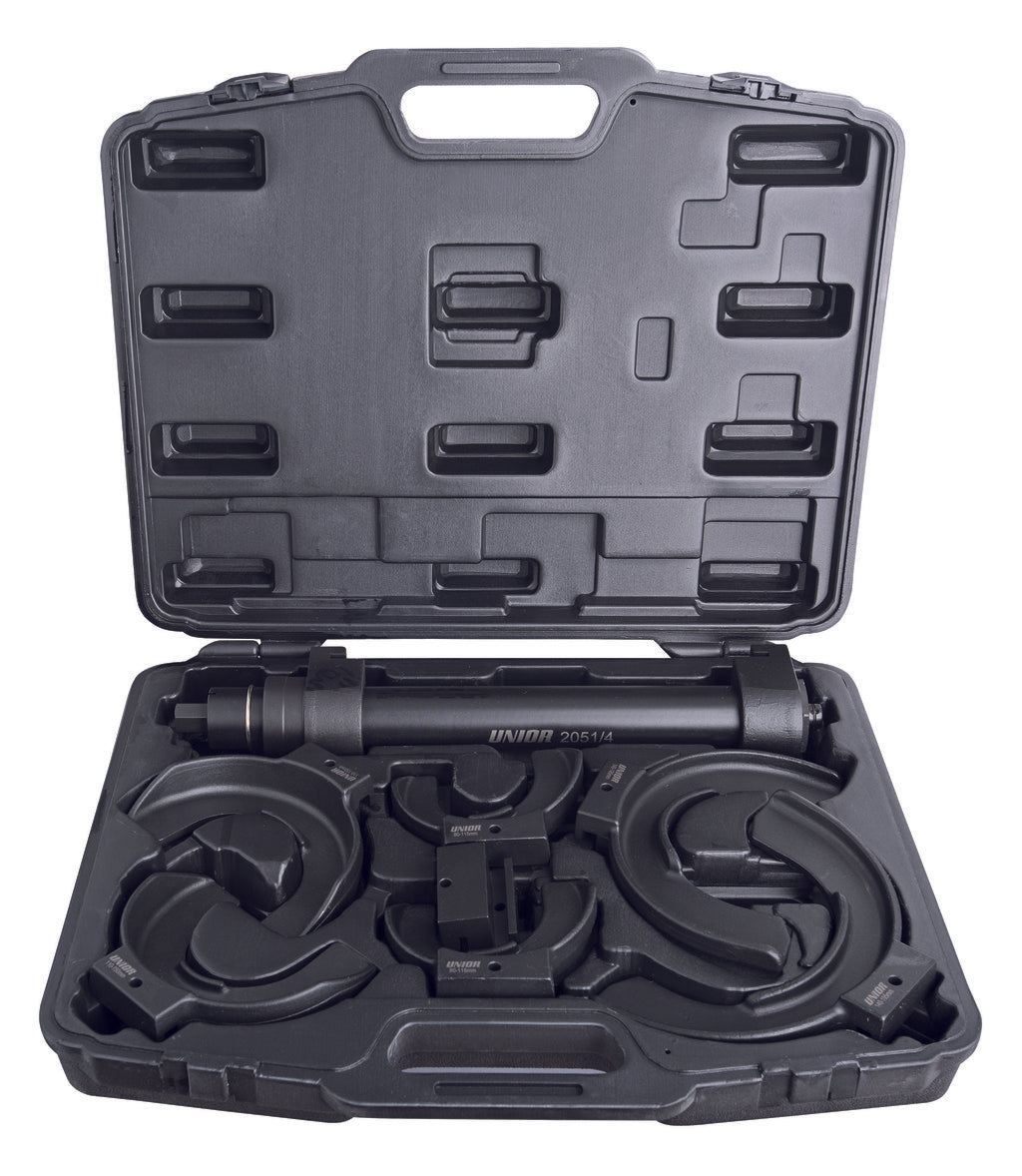 - This Unior professional tool, under article number 2051, is intended for the removal of car shock absorbers and is mainly used to compress the springs in MacPherson struts. Since the number of versions of the MacPherson strut is always increasing, the tool set contains three different pairs of grippers that almost completely cover the range of different MacPherson struts. The tool set also includes a spacer bar for conical springs, which increases the usefulness of the Shock Absorber Remover. Development of this tool took safety into account as the large forces involved in removing shock absorbers may present a risk of injury to the user. For this reason, all grippers in the set feature enlarged grip edges to firmly grip the spring in the tool thus prevent any possibility of slipping, which could injure the tool user. The recommended load for the tool is 9000 N. The maximum load for the tool is up to 37000 N. The tool is supplied in a durable PVC case that enables easier and safer transportation.